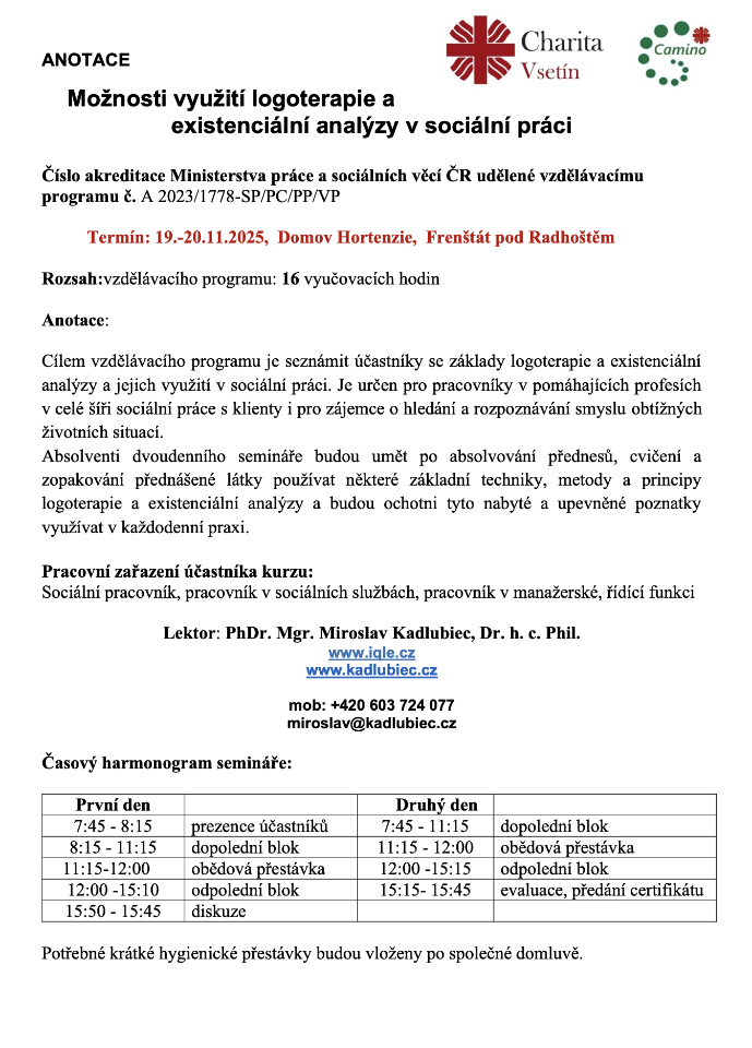 Přátelé, dovolte mi podělit se o nádhernou zkušenost. Měl jsem tu čest přijmout pozvání a vést dvoudenní seminář v Domově pro seniory Hortenzie na téma: „Možnosti využití logoterapie a existenciální analýzy Viktora Emila Frankla a jeho pokračovatelů v sociální práci“. Dva dny naplněné vstřícností, vzájemným obohacováním se zkušenostmi, prožitky, vnímavostí, zaujetím. Tyto dva dny budou po právu uloženy do „Chrámu paměti“. Děkuji za ně všem zúčastněným, kdož tento dialog absolvovali, vážím si toho.